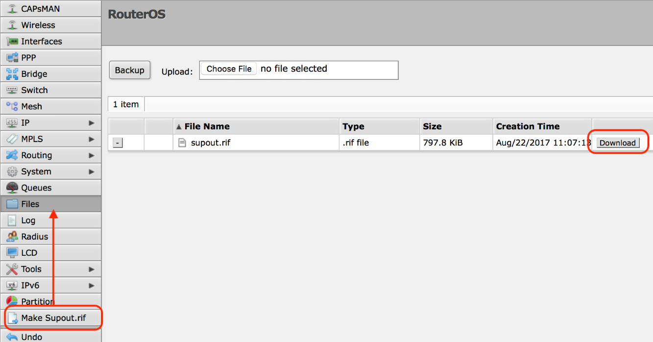 Soubor supout slouží k ladění systému MikroTik RouterOS a k rychlejšímu řešení otázek podpory. Veškeré informace o routeru MikroTik jsou uloženy v binárním souboru, který je uložen v routeru a lze jej stáhnout ze pomocí FTP. V případě potřeby lze soubor vygenerovat také ve složce "/flash" na zařízeních s pamětí typu FLASH nebo na externí paměťové jednotce, a to zadáním úplné cesty k souboru "name=flash/supout.rif". Obsah tohoto souboru si můžete prohlédnout ve svém účtu Mikrotik, stačí kliknout na "Supout.rif viewer" umístěný v levém sloupci a soubor nahrát.