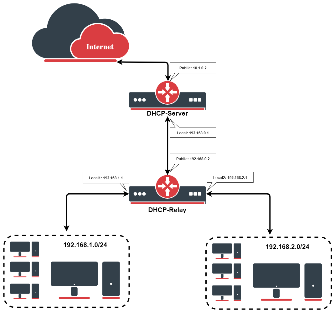Uvažujme, že máte několik IP sítí za jinými směrovači, ale chcete mít všechny servery DHCP na jediném směrovači. K tomu potřebujete v síti DHCP relay, který bude předávat požadavky DHCP od klientů na server DHCP.