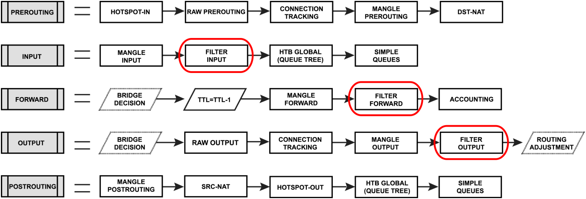 - input - slouží ke zpracování paketů vstupujících do routeru přes jedno z rozhraní s cílovou IP adresou, která je jednou z adres routeru.