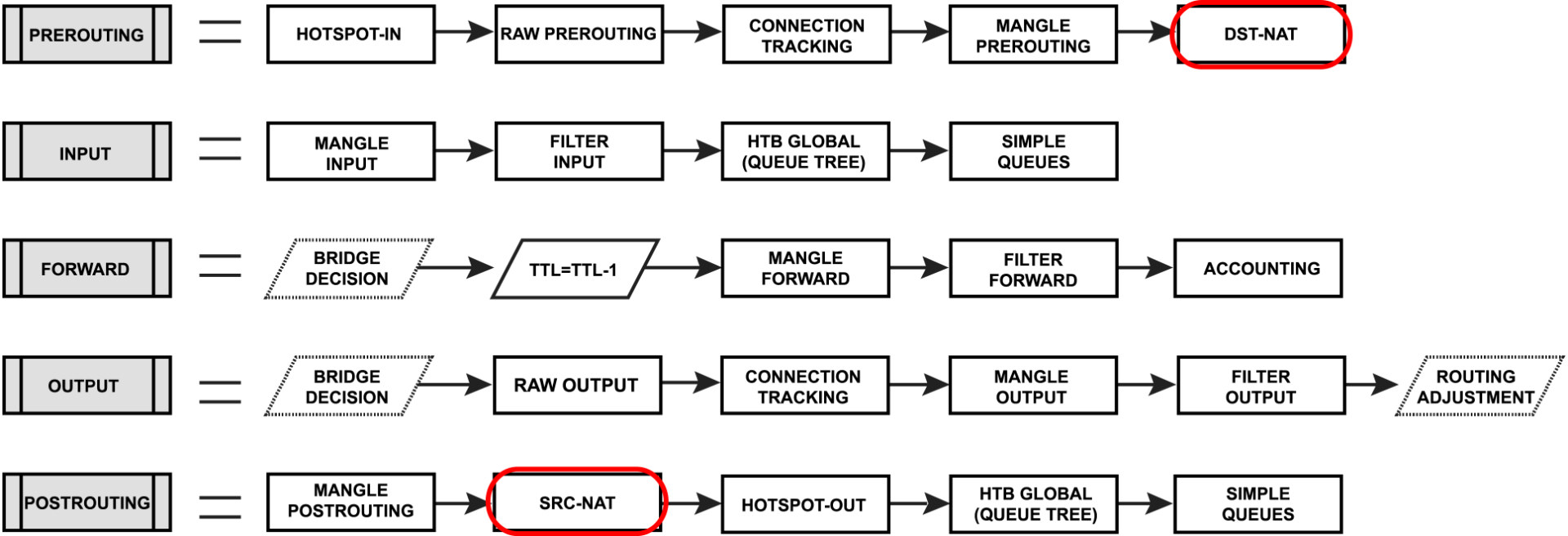 - source NAT neboli srcnat. Tento typ NAT se provádí na paketech, které pocházejí z NATované sítě. Router NAT nahradí lokální zdrojovou IP adresu paketu novou veřejnou IP adresou při průchodu routerem. Na pakety s odpovědí, které putují opačným směrem, se aplikuje opačná operace.