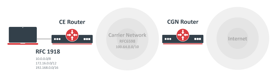 CGNAT (NAT444) Pro boj s vyčerpáním adres IPv4 bylo zavedeno nové RFC 6598. Jde o využití sdíleného adresního prostoru 100.64.0.0/10 uvnitř sítě operátora a provedení NAT na okrajovém směrovači operátora na jedinou veřejnou IP nebo veřejný rozsah IP.
