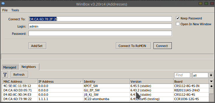 - Winbox v režimu RoMON vyžaduje, aby byl agent nejnovější verze, aby se mohl připojit k nejnovější verzi routerů.