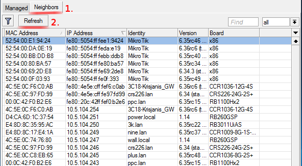 Můžete také použít funkci zjišťování sousedů, která zobrazí seznam dostupných routerů: V seznamu nalezených routerů se můžete kliknutím na sloupec s IP nebo MAC adresou připojit k danému směrovači.