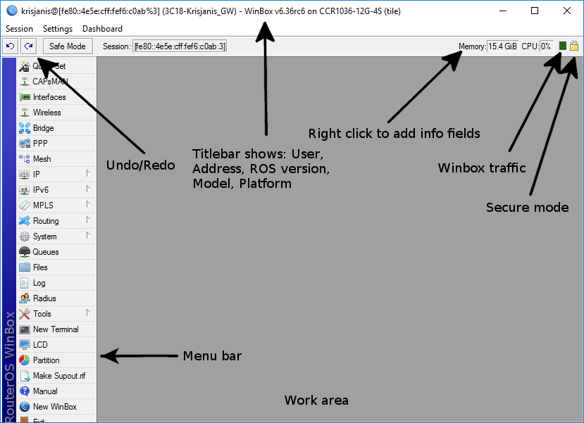 [username]@[Router's IP or MAC] ( [RouterID] ) - Winbox [ROS version] on [RB model] ([platform])Na levé straně hlavního panelu nástrojů se nachází: