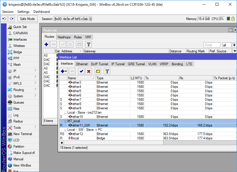 Winbox má rozhraní MDI, což znamená, že všechna okna konfigurace menu (podřízená) jsou připojena k hlavnímu (rodičovskému) oknu Winboxu a zobrazují se v pracovní oblasti. Podřízená okna nelze vytahovat z pracovního prostoru. Na výše uvedeném snímku obrazovky si všimněte, že okno Rozhraní je přetaženo mimo viditelnou pracovní oblast a ve spodní části se objevil vodorovný posuvník. Pokud se některé okno nachází mimo hranice viditelné pracovní oblasti, zobrazí se svislé a/nebo vodorovné posuvníky.