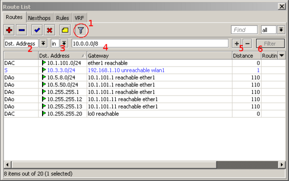 Winbox umožňuje sestavit zásobník filtrů. Například pokud je potřeba filtrovat podle cílové adresy a brány, pak se