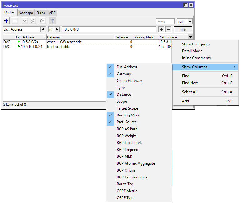 Téměř každé okno má tlačítko Seřadit. Po kliknutí na toto tlačítko se zobrazí několik možností, jak je znázorněno na obrázku níže Příklad ukazuje, jak rychle odfiltrovat trasy v rozsahu 10.0.0.0/8.