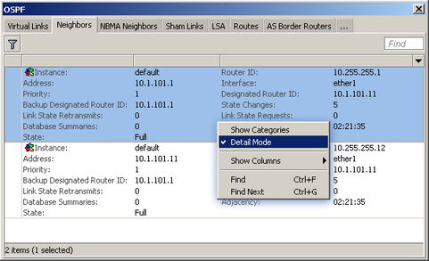 Téměř všechna okna mají na pravé straně panelu nástrojů vstupní pole pro rychlé vyhledávání. Jakýkoli text zadaný do tohoto pole je vyhledán ve všech položkách a zvýrazněn, jak je znázorněno na následujícím obrázku. Všimněte si, že na pravé straně vedle pole pro zadání rychlého vyhledávání je rozevírací pole. V aktuálně otevřeném okně (IP Route) umožňuje toto rozevírací pole rychle roztřídit položky podle směrovacích tabulek. Pokud je například vybrána hlavní, budou v seznamu uvedeny pouze trasy z hlavní směrovací tabulky.