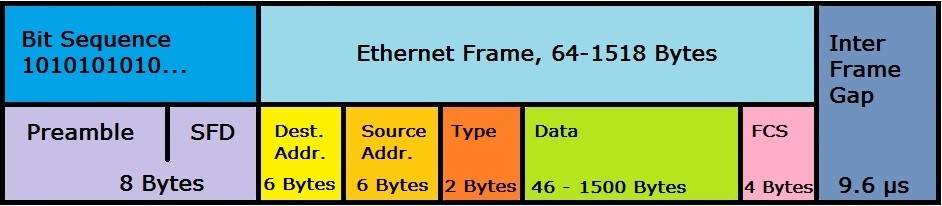 Kompletní data, která jsou po síti odeslána mají výslednou strukturu rámce: