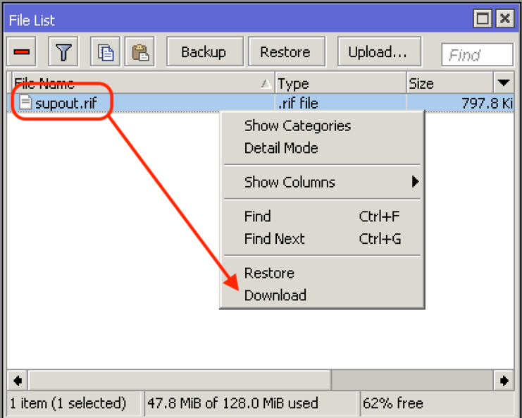 Soubor supout slouží k ladění systému MikroTik RouterOS a k rychlejšímu řešení otázek podpory. Veškeré informace o routeru MikroTik jsou uloženy v binárním souboru, který je uložen v routeru a lze jej stáhnout ze pomocí FTP. V případě potřeby lze soubor vygenerovat také ve složce "/flash" na zařízeních s pamětí typu FLASH nebo na externí paměťové jednotce, a to zadáním úplné cesty k souboru "name=flash/supout.rif". Obsah tohoto souboru si můžete prohlédnout ve svém účtu Mikrotik, stačí kliknout na "Supout.rif viewer" umístěný v levém sloupci a soubor nahrát.
