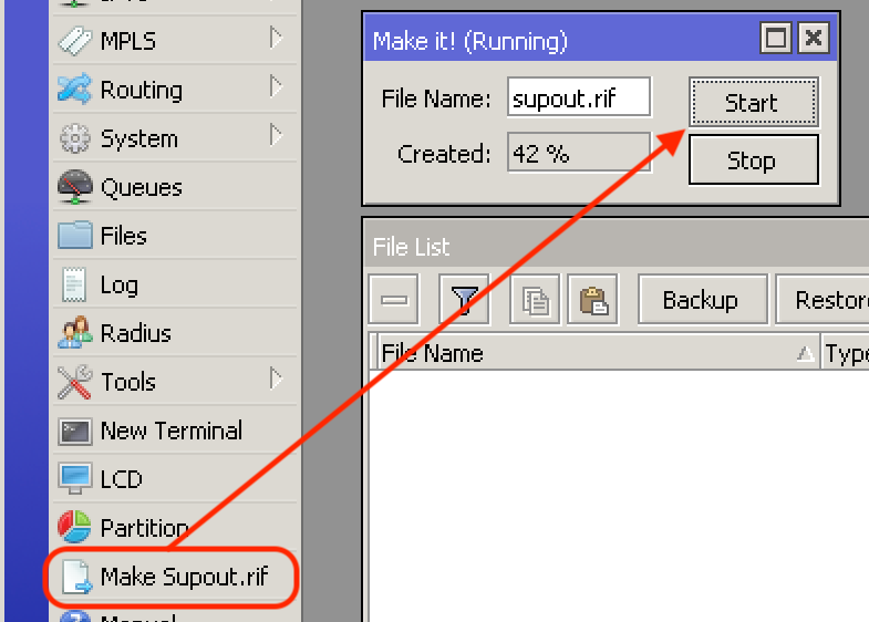 Chcete-li tento soubor vytvořit v aplikaci Winbox, klikněte na "Make Supout.rif".