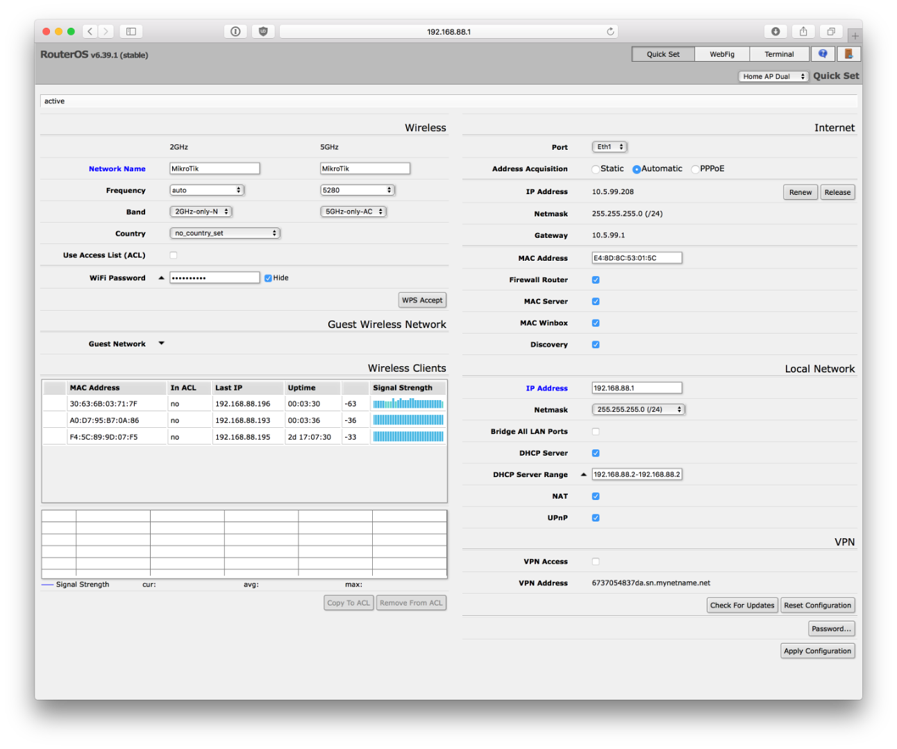 Quickset je jednoducý průvodce konfigurací, který připraví váš router na několik kliknutí. Je to první obrazovka, která se uživateli zobrazí po otevření výchozí IP adresy 192.168.88.1 ve webovém prohlížeči.